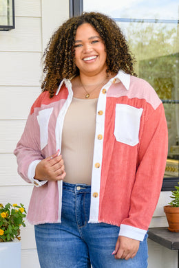 Draw You In Corduroy Color Blocked Shacket In Mauve