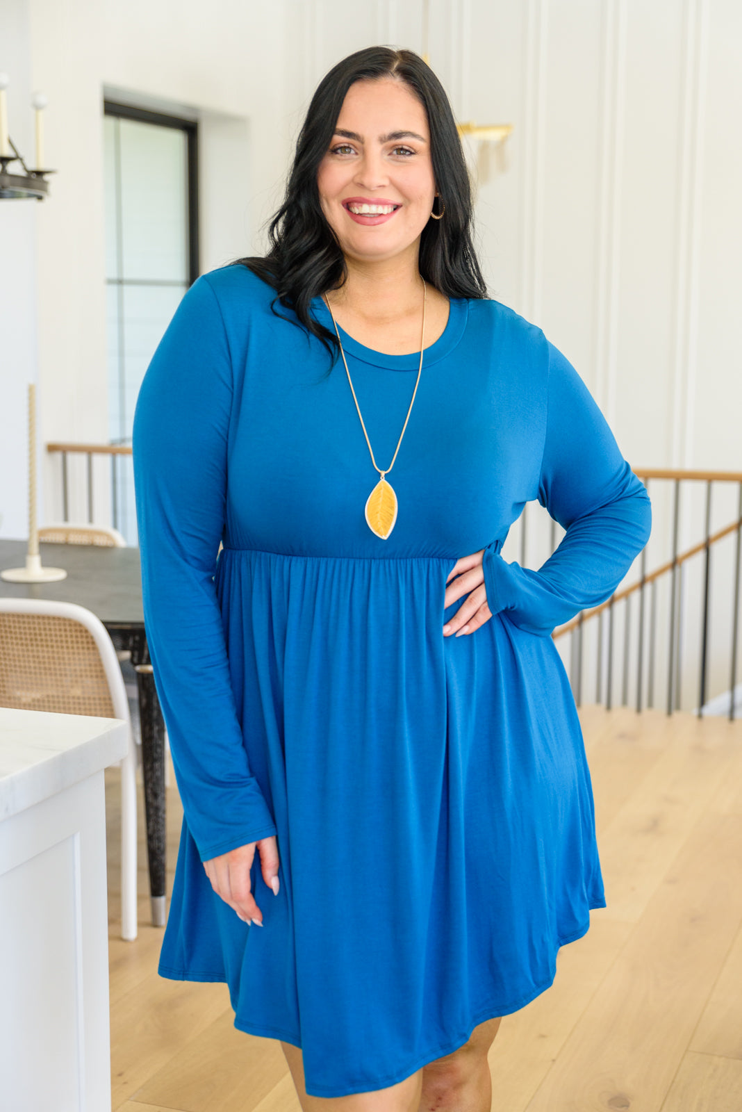 Pair the Cara Long Sleeve Knit Mini Dress In Teal with a cardigan, boots and a wide brim hat for a cute transitional look! This stretchy, lightweight long sleeve dress features a round neckline and fitted bust that tops a babydoll style skirt with a curved hem. We are absolutely in love with this simple yet beautiful transitional piece!