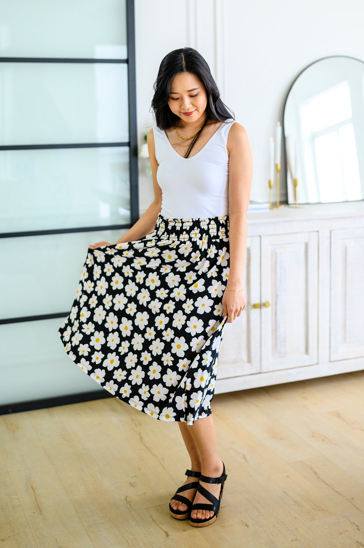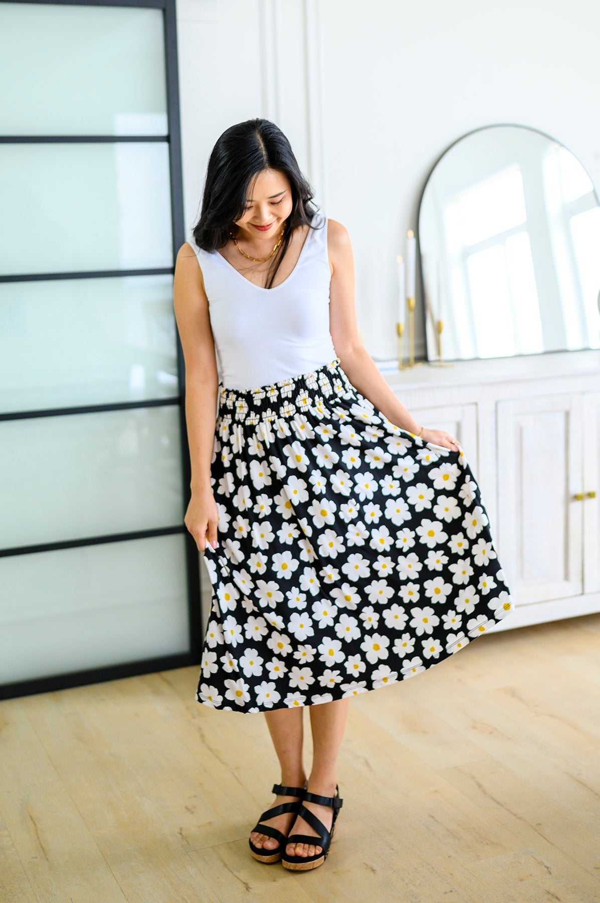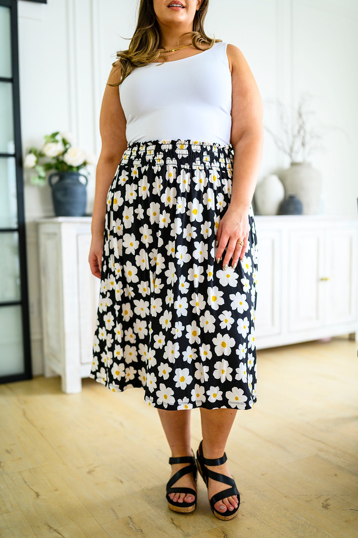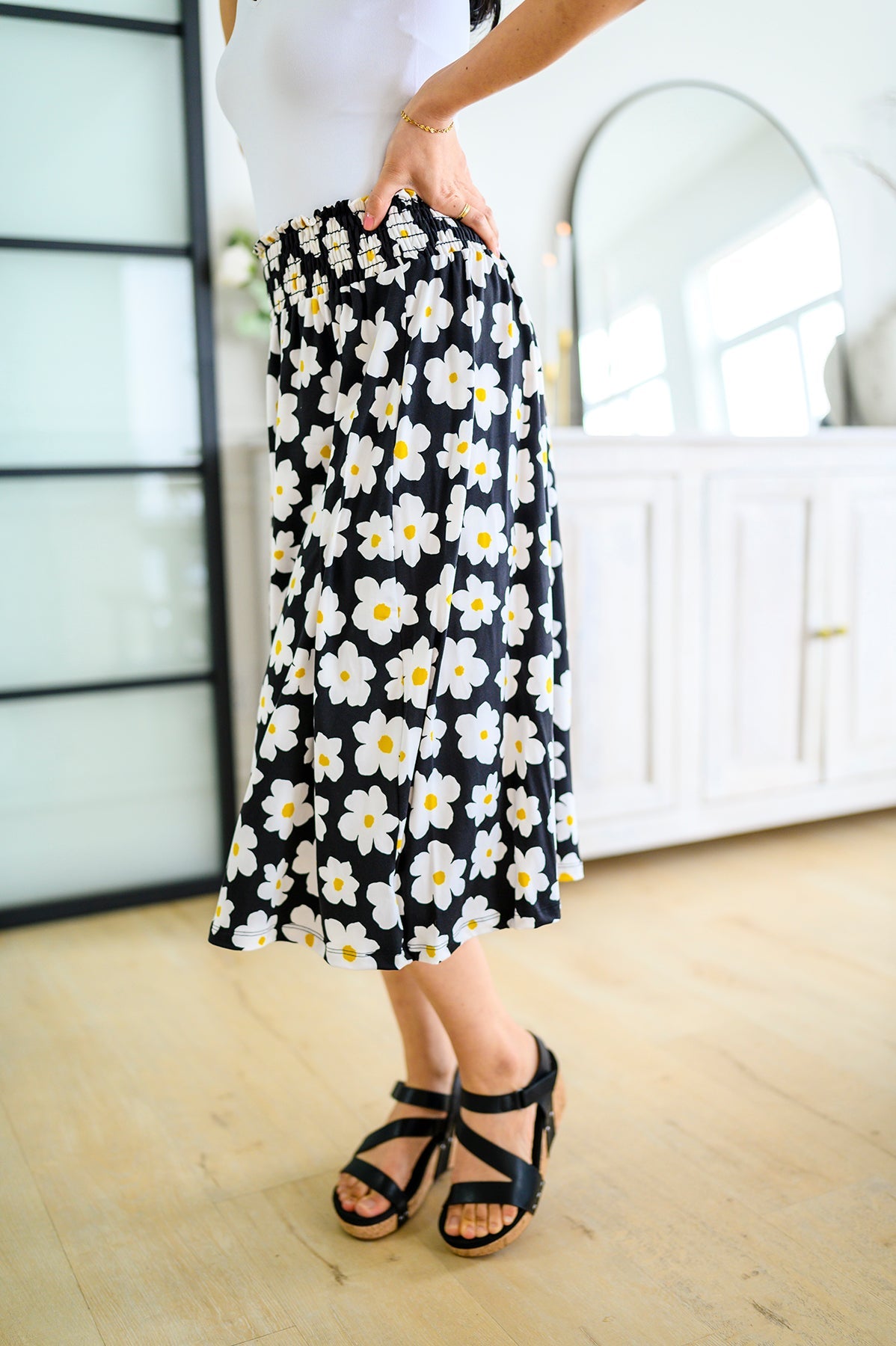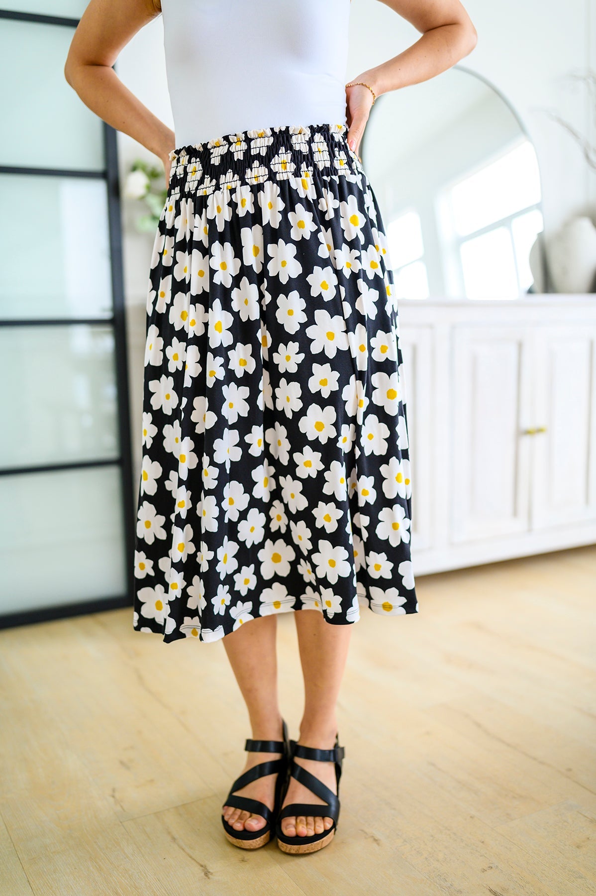 Look no further for the perfect spring look than the Hey Daisy Skirt! Featuring a smocked waistband, bold daisy print, and a-line silhouette, this midi skirt is the epitome of playful style. Buttery soft fabric ensures maximum comfort while making a statement. Who says you can't have fun and look good?