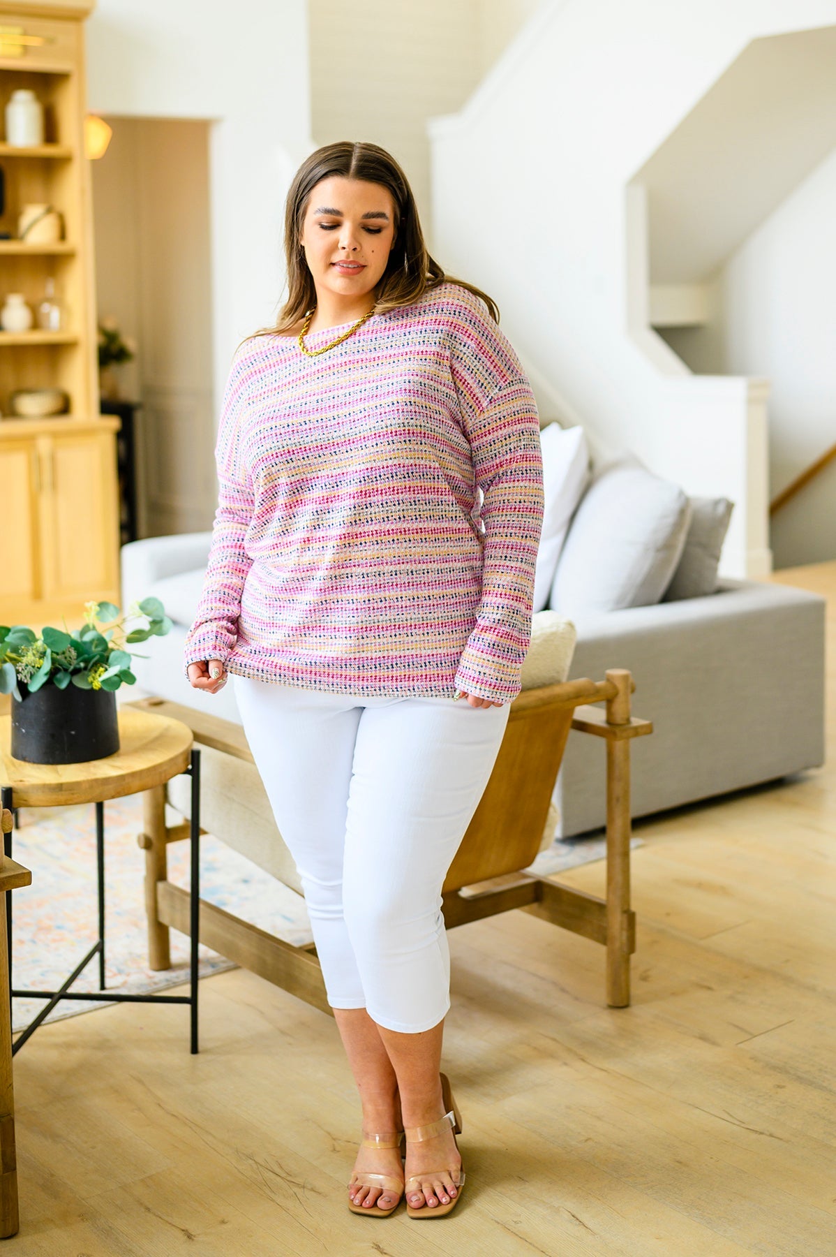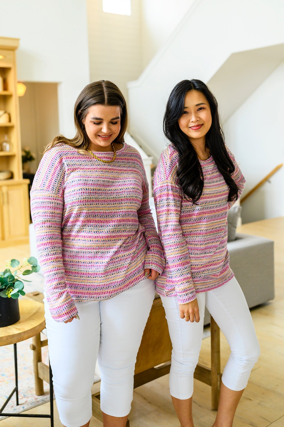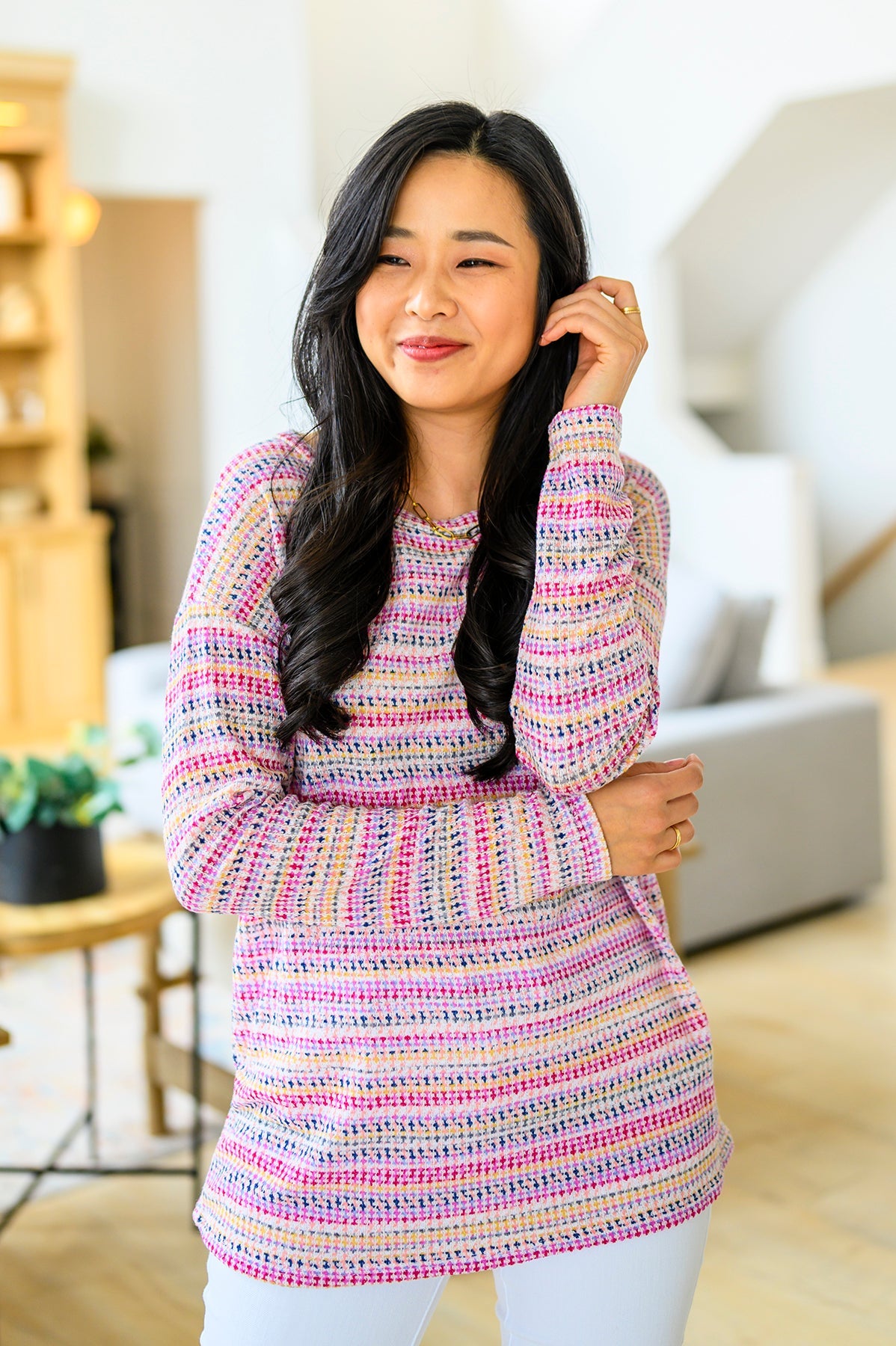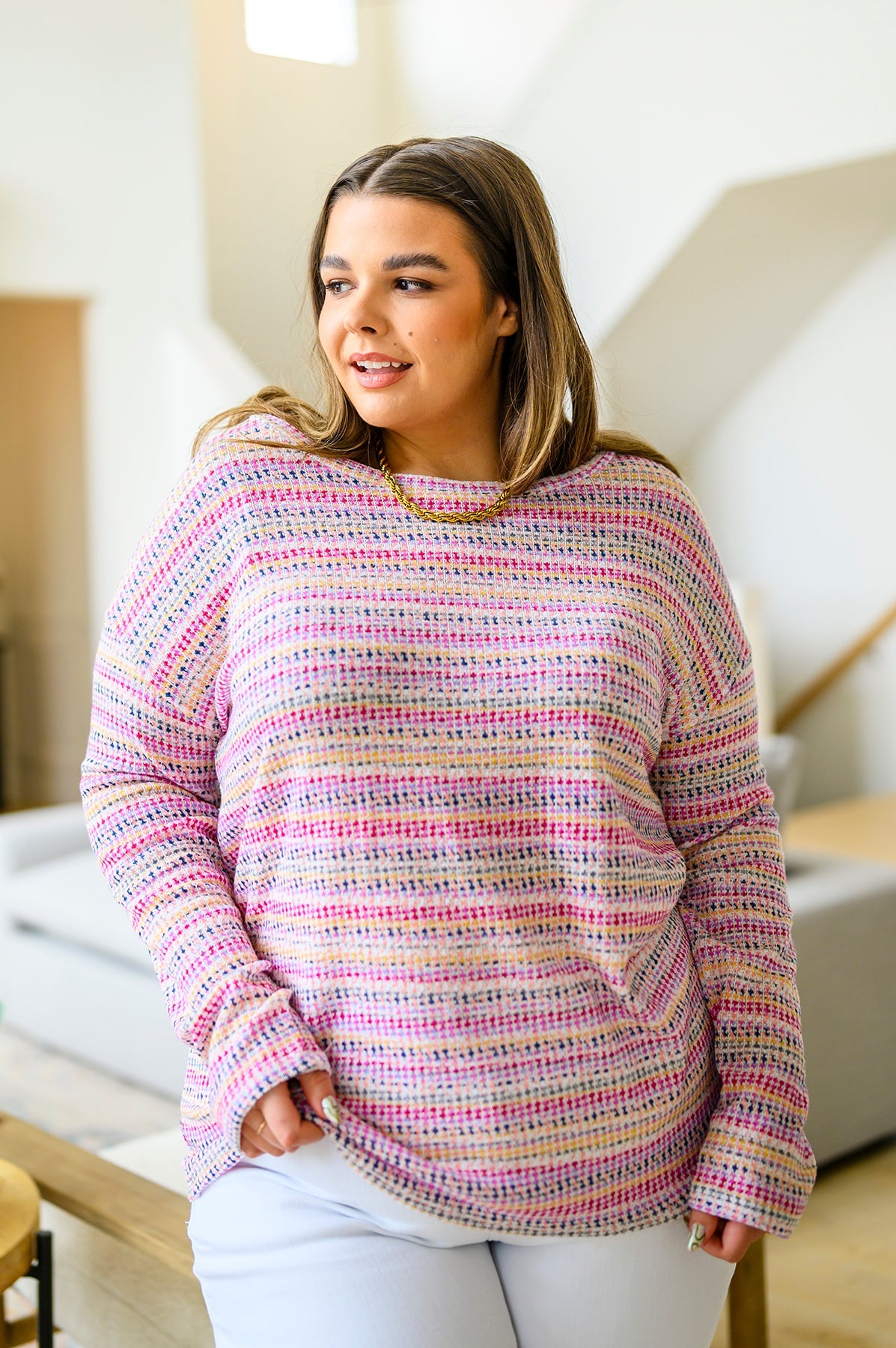 Introducing the Just About Right Top: the lightweight, droopy-shouldered top that has it all! Featuring a fun, variegated woven stripe and a soft waffle-knit, it’s the perfect way to add a little texture to your wardrobe without the added weight. Look great and feel even better in this long-sleeved stunner!