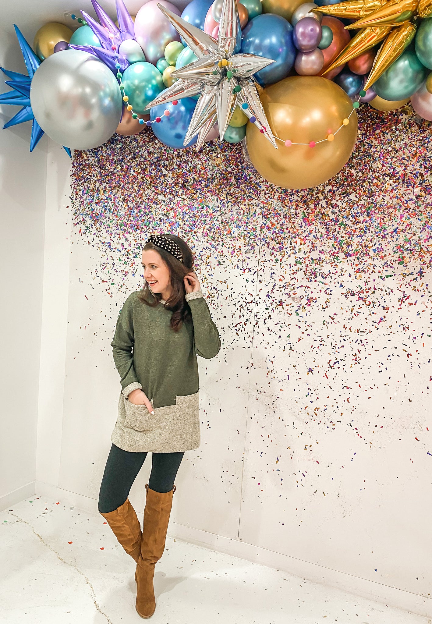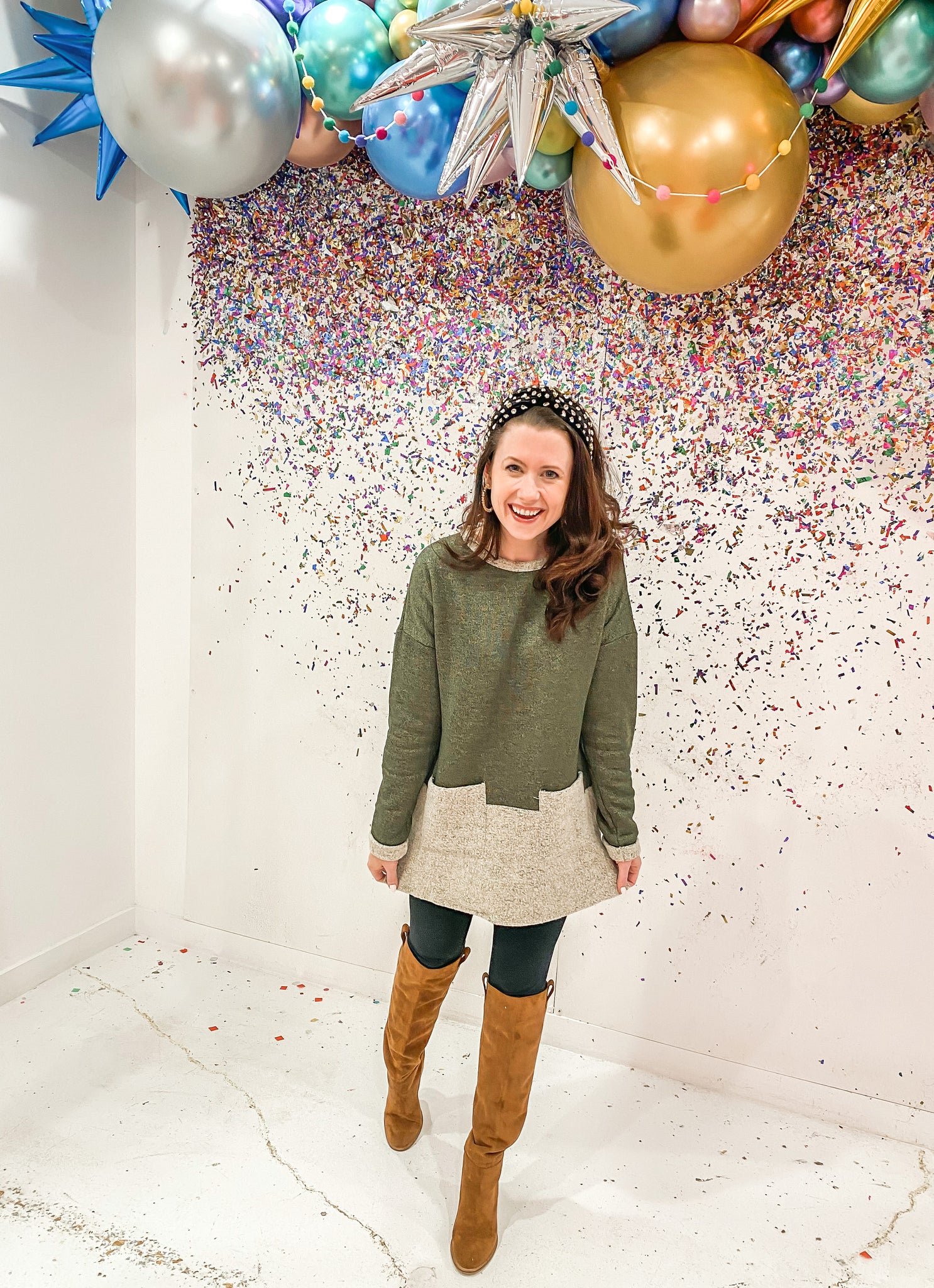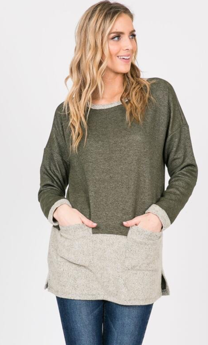 Head to the closet and don't know what to wear?? We found the top that is the easiest "go-to" . Dress her up with tall boots and leggings or rock her with your favorite denim. This top is the coziest color block tops ever. We're making this one with Heavy brushed french terry dual-sided fabric. Two pockets add a more casual feeling. The length is tunic length.